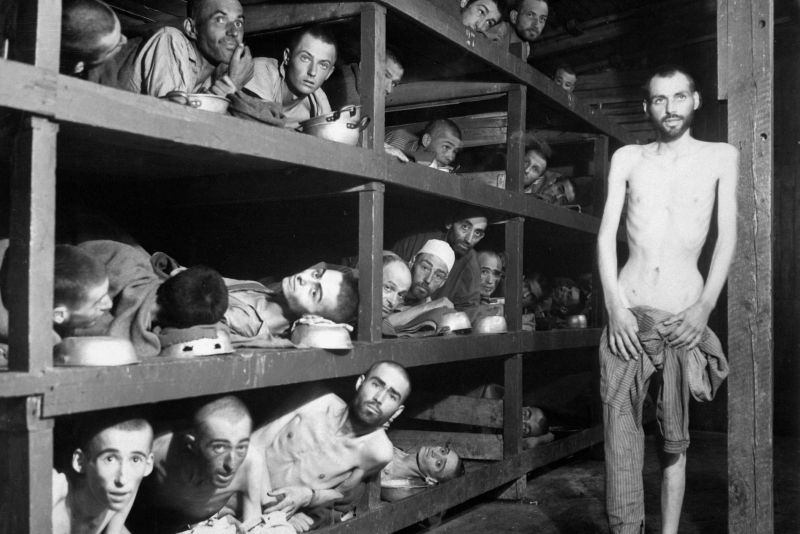 Foto: Eliberarea lagărului Buchenwald, aprilie 1945 (Elie Wiesel este al șaptelea din stânga pe polița a doua de jos).