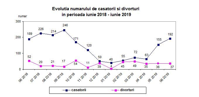 , cu 1 mai mult comparativ cu luna mai 2019.Comparativ cu aceeaşi perioada a anului precedent, în luna iunie 2019, s-au înregistrat cu 15 divorţuri mai puţine, iar numărul căsătoriilor a fost mai mare cu 3 faţă de luna iunie 2018.