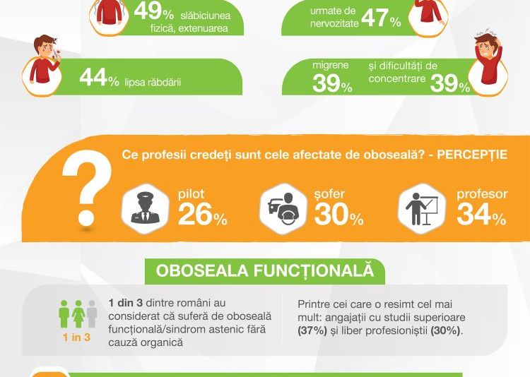 Astfel, românii consideră că, în medie, doar unul din doi oameni din jurul lor suferă de oboseală. Profesiile percepute ca fiind cele mai afectate de oboseală sunt profesor (34%), șofer (30%) și pilot (26%).