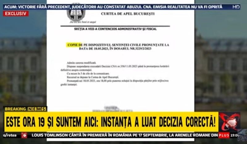 Victorie fără precedent în fața cenzurii abuzive a Consiliului Național al Audiovizualului! Curtea de Apel București a confirmat, astăzi, că Realitatea PLUS a avut dreptate! Judecătorii au constatat abuzul Consiliului Național al Audiovizualului, care ceruse suspendarea emisiei Realitatea PLUS timp de 10 minute.