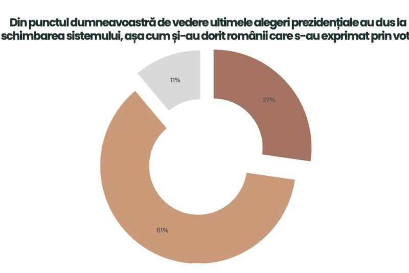 La întrebarea "Din punctul dumneavoastră de vedere ultimele alegeri prezidențiale au dus la schimbarea sistemului, așa cum și-au dorit românii care s-au exprimat prin vot?", 61% dintre români au răspuns că a rămas același.