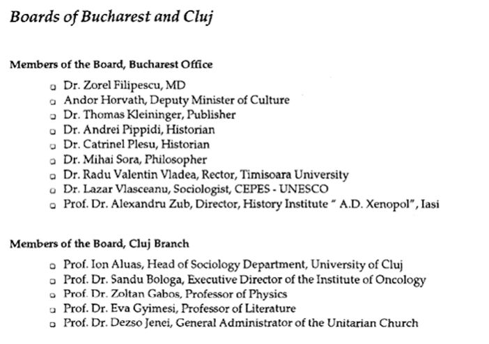 Potrivit primului raport întocmit de fundația lui Soros din România, în funcția de co-președinte se afla Sandra Pralong. Ea a fost consiliera președinților Emil Constantinescu și Klaus Iohannis. Pralong a fost angajată la palatul Cotroceni până la finalul mandatului lui Klaus Iohannis, ea a fost eliberată din funcție la finalul lunii martie de către Ilie Bolojan. Ea s-a ocupat de relația cu românii din afara graniței. Din conducerea fundației Soros în românia ar fi făcut parte și Mihai Șora, unul dintre principalii susținători ai regimului Iohannis și al comunității rezist.