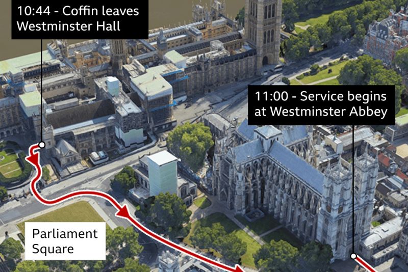 E liniște la Londra. Ușile de la Westminster Hall au fost închise pentru public de la ora 8:30, ora României. Au loc ultimele pregătiri pentru cortegiul funerar, sicriul Regine Elisabeta a II-a urmând ca în patru ore să ajungă la Westminster Abbey. Polițiștii și personalul de securitate sunt singurele persoane care se află pe străzi. Sicriul Reginei va fi mutat la Westminster Abbey, Abaţia urmând să fie deschisă la ora 10.00 pentru invitaţii la înmormântare, anunță BBC.