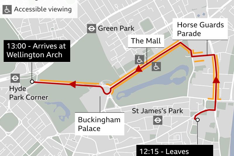 Ora 14:15 După slujba de înmormântare, la aproximativ 14:15, sicriul Reginei va fi condus într-o procesiune de la Abație la Wellington Arch. În acest timp, celebrul clopot din turnul cu ceas al Londrei, Big Ben, va suna la intervale de un minut, pe măsură ce procesiunea se mișcă încet pe străzile capitalei. Salve de foc vor fi trase, de asemenea, în fiecare minut din Hyde Park. Camilla, Regina Consort, Prințesa de Wales, Contesa de Wessex și Ducesa de Sussex se vor alătura procesiunii în mașini. Odată ajuns la Wellington Arch, în jurul orei 15:00, sicriul va fi pregătit pentru călătoria sa finală la Castelul Windsor. Castelul, locuit continuu de 40 de monarhi britanici de-a lungul a aproape 1.000 de ani, a avut o semnificație specială pentru Regină.