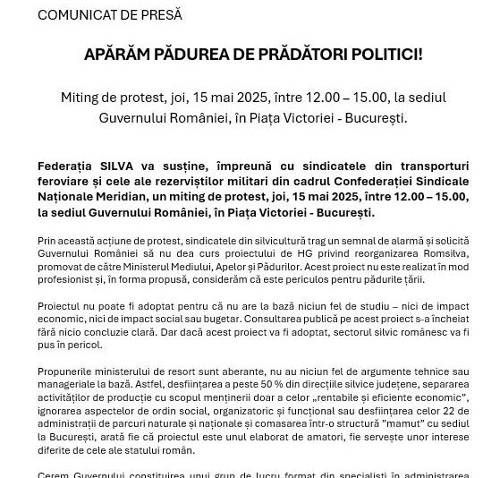 "Prin această acțiune de protest, sindicatele din silvicultură trag un semnal de alarmă și solicită Guvernului României să nu dea curs proiectului de HG privind reorganizarea Romsilva, promovat de către Ministerul Mediului, Apelor și Pădurilor. Acest proiect nu este realizat în mod profesionist și, în forma propusă, considerăm că este periculos pentru pădurile țării", au anunțat sindicaliștii, printr-un comunicat.