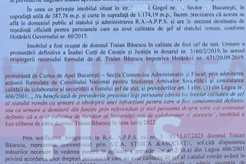 Potrivit documentului prezentat de Anca Alexandrescu, Ilie Bolojan locuiește din luna iulie într-o locuință destinată exclusiv foștilor șefi de stat, în care, de altfel, a locuit și Traian Băsescu.