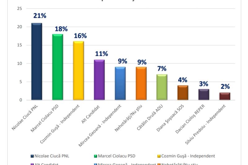 În sondajul privind opțiunea pentru candidații la președinție care și-au anunțat intenția de a candida, Nicolae Ciucă se află pe primul loc, urmat de Marcel Ciolacu.