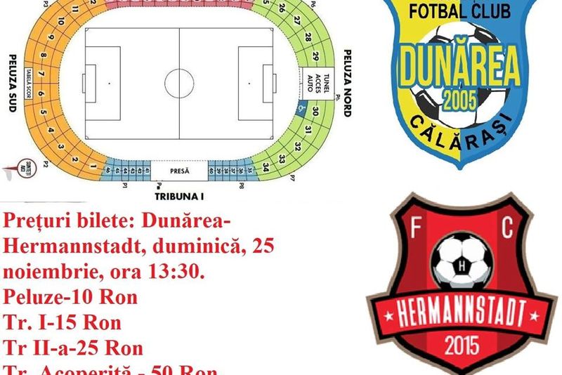 Duminică, 25 noiembrie, de la ora 13.30, se va desfăşura, pe arena Ion Comşa din Călăraşi, partida dintre Dunărea şi FC Hermannstadt, din cadrul etapei a 16-a a ligii I Betano.